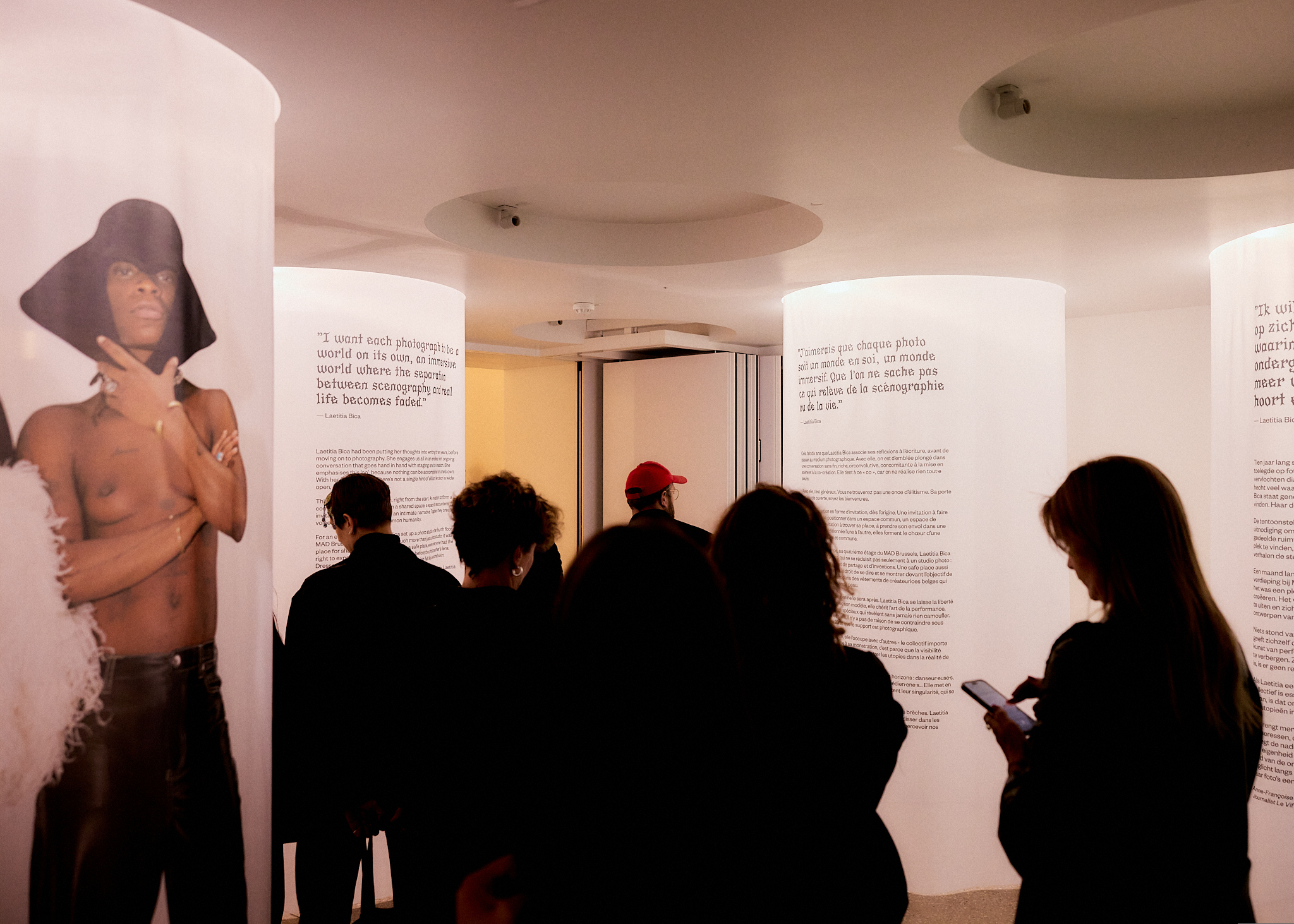 « J’aimerais que chaque photo soit un monde en soi, un monde immersif. Que l’on ne sache pas ce qui relève de la scénographie ou de la vie. » Cela fait dix ans que Laetitia Bica associe ses réflexions à l’écriture, avant de passer au medium photographique. Avec elle, on est d’emblée plongé dans une conversation sans fin, riche, circonvolutive, concomitante à la mise en scène et à la co-création. Elle tient à ce « co », car on ne réalise rien tout.e seul.e. Avec elle, c’est généreux. Vous ne trouverez pas une once d’élitisme. Sa porte est grande ouverte, soyez les bienvenu.es. C’est une exposition en forme d’invitation, dès l’origine. Une invitation à faire communauté, à se positionner dans un espace commun, un espace de rencontres. Une invitation à trouver sa place, à prendre son envol dans une narration intime. Additionnée l’une à l’autre, elles forment le choeur d’une humanité revendiquée et commune. En un mois de résidence, au quatrième étage du Mad Brussels, Laetitia Bica a installé un studio photo, qui ne se réduisit pas seulement à un studio photo : ce fut un lieu d’échanges et de partage et d’inventions. Une safe place aussi où chaque personne avait le droit de se dire et se montrer devant l’objectif de la photographe, se glissant dans des vêtements de créateurices belges qui leur font comme une seconde peau. Rien n’était figé d’avance, rien ne le sera après. Laetitia Bica se laisse la liberté d’entrer en résonance avec son modèle, elle chérit l’art de la performance, des make-up et des effets spéciaux qui révèlent sans jamais rien camoufler. Elle fait appel à tous les sens, il n’y a pas de raison de se contraindre sous prétexte qu’on est en 2D et que le support est photographique. Laetitia occupe un espace, elle l’occupe avec d’autres - le collectif importe pour elle. Et si elle participe à sa monstration, c’est parce que la visibilité importe tout autant. Car il s’agit de faire entrer les utopies dans la réalité de ce monde. Elle a rassemblé des personnes venues de tous les horizons : danseur•euse•s, drag , performeur•euse•s, DJs, make-up artist, comédien•ene•s… Elle met en lumière les corps, tous les corps, habités, qui racontent leur singularité, qui se moquent des proportions. Et dans les mondes à la lisières des nôtres, elle trouve les brèches. Laetitia Bica ne force jamais rien, elle permet à la lumière de se glisser dans les interstices. Voilà pourquoi on ne sera pas étonné d’entrapercevoir nos animalités secrètes ainsi photographiées.
